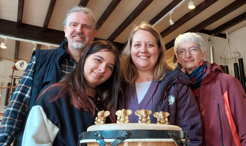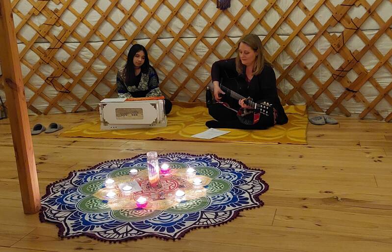 Ze wonen in Oostenrijk, ik heb hen ontmoet tijdens de retreat van Kevin James & Susana op Corfu. Ze zijn het avontuur aangegaan om “Living room concerten” te doen en ik heb hen uitgenodigd om bij mij te komen logeren en een concert in de yurt van Pavan en Kathy te doen. Tina stelde voor om dat tijdens mijn mantra cirkel te doen en er een mooie mix van Heartsongs en Mantra’s van te maken.