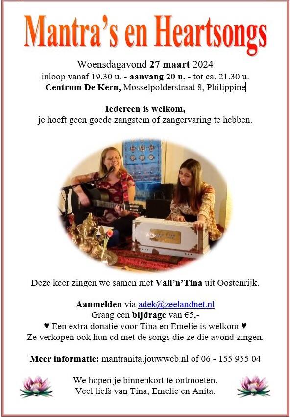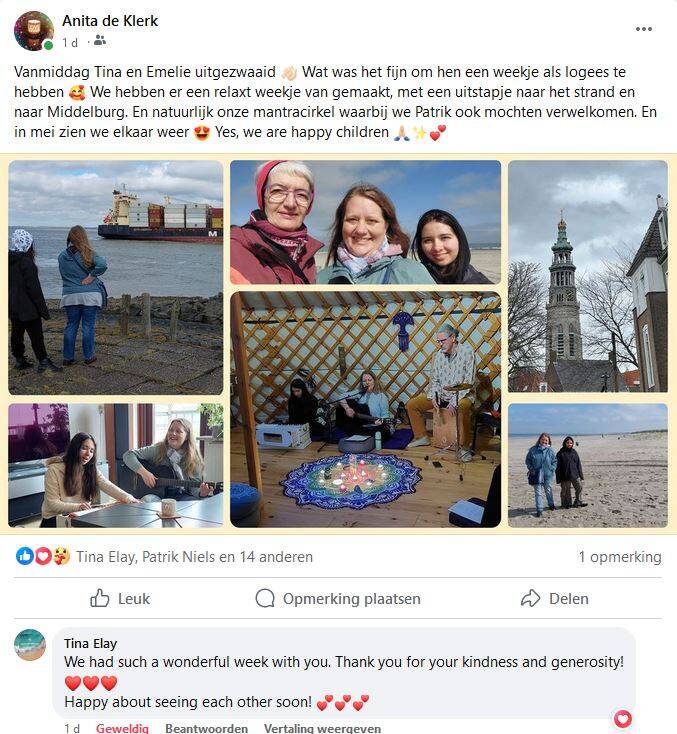 Woensdag 27 maart 2024 komen Tina en haar dochter Emelie, Vali’n’Tina, weer. Ik heb hen ontmoet tijdens het retreat van Kevin James & Susana op Corfu en er is een fijne vriendschap ontstaan.